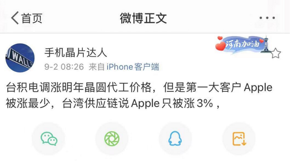知名半导体产业链博主@手机晶片达人 最新发文称,台积电调涨明年晶圆代工价格,但据中国台湾地区供应链透露,台积电对第一大客户苹果涨幅最低,仅为3%。
