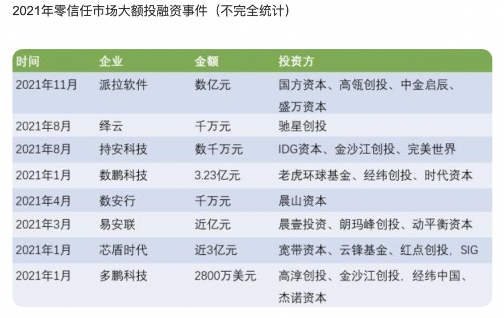 同时热度骤增的零信任,也吸引了大批资本入场。据不完全统计,2021年国内零信任市场已完成多起大额投融资,包括派拉软件、绎云、持安科技、数鹏科技、数安行、易安联、芯盾时代、多鹏科技等在内的多家创新企业,获得了从数千万到数亿元不等的融资。