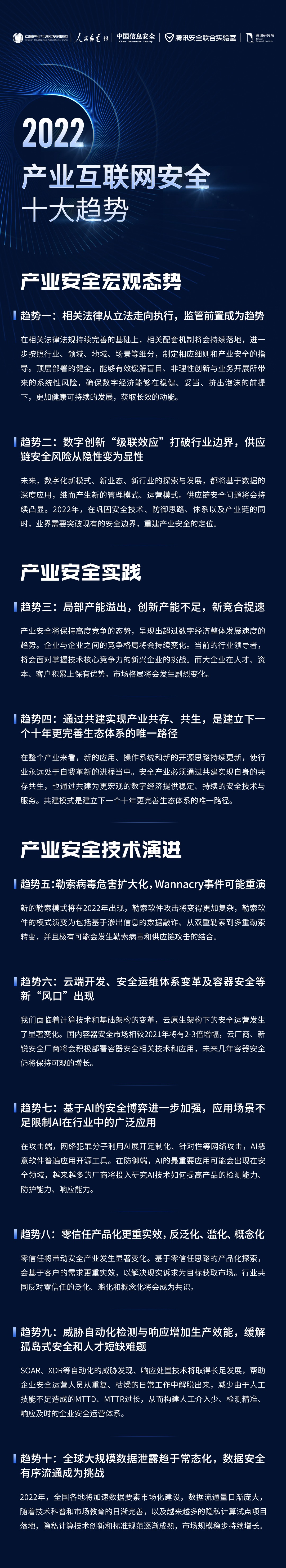 近日,在中国产业互联网发展联盟指导下,人民邮电报、中国信息安全、腾讯安全联合实验室、腾讯研究院联合推出了《2022产业互联网安全十大趋势》。该报告指出,2022年,业界有必要在巩固现有安全技术和防御思路、体系以及产业链的同时,突破现有的网络安全边界,重建产业安全的定位。