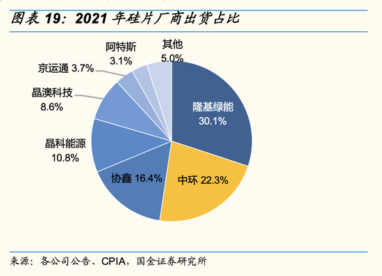 当前,硅片市场呈现TCL中环和隆基绿能双龙头局面,2021年两家单晶硅片合计出货占比约49%。