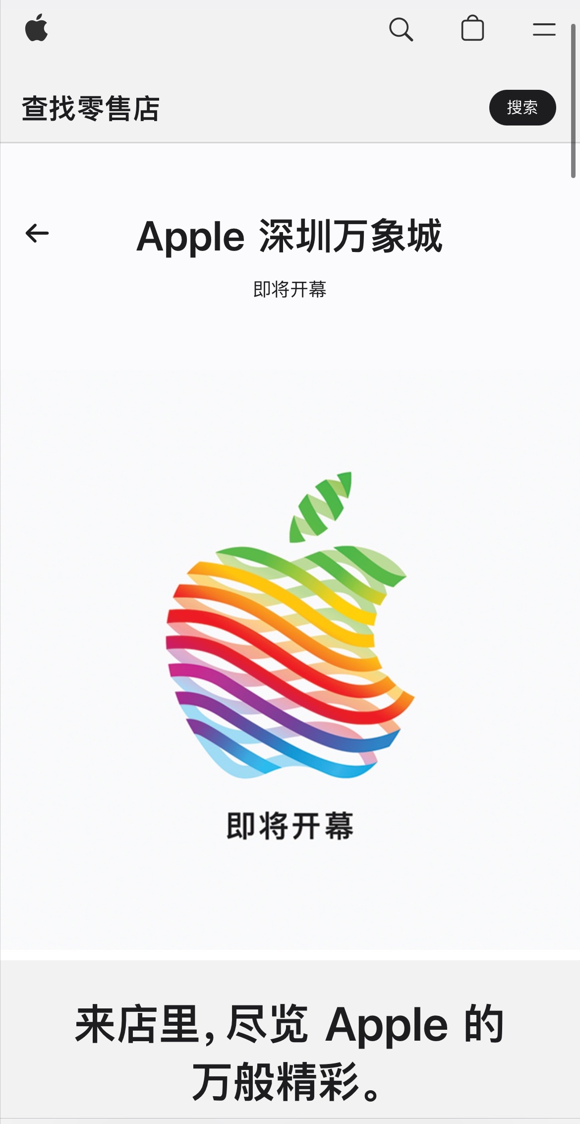 根据此前消息,苹果将在深圳筹建第二家 Apple Store。近日,IT之家的小伙伴发现,苹果官网显示深圳万象城 Apple Store 即将开幕。