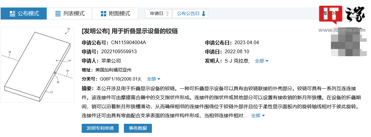 苹果公司“用于折叠显示设备的铰链”专利于近期公布。
