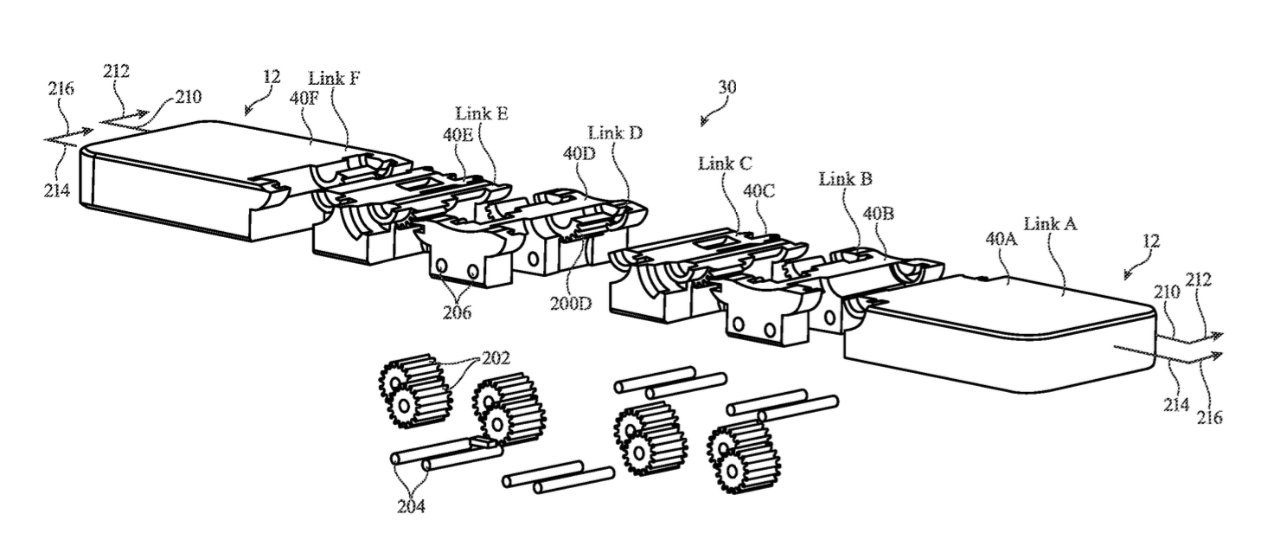 另外,在名为“Hinges for Folding Display Devices”(IT之家注:为折叠屏幕设备设计的多种铰链)专利中,提及了一种包含 4 对小齿轮和 6 个静态部件组成的复杂铰链设计。