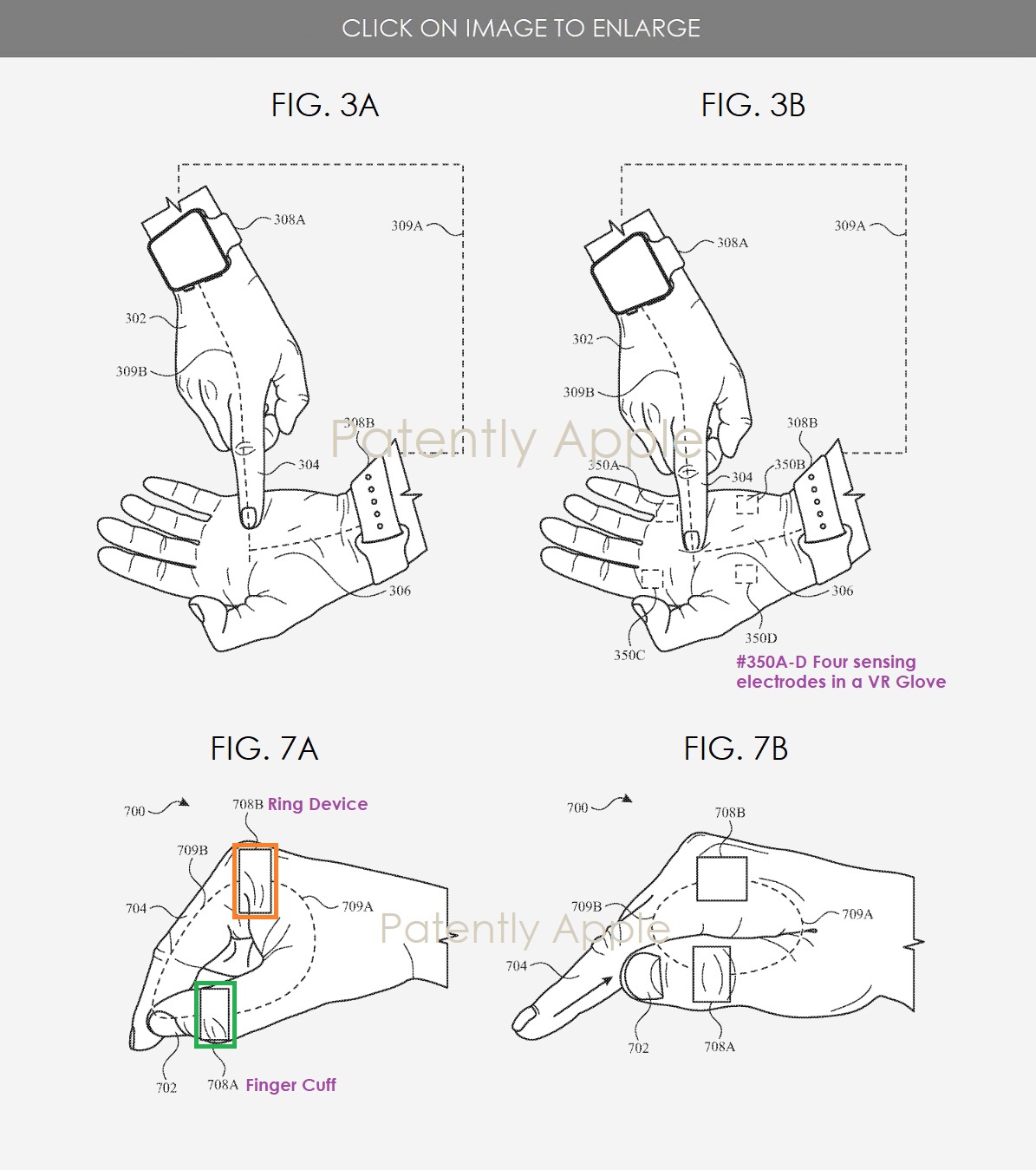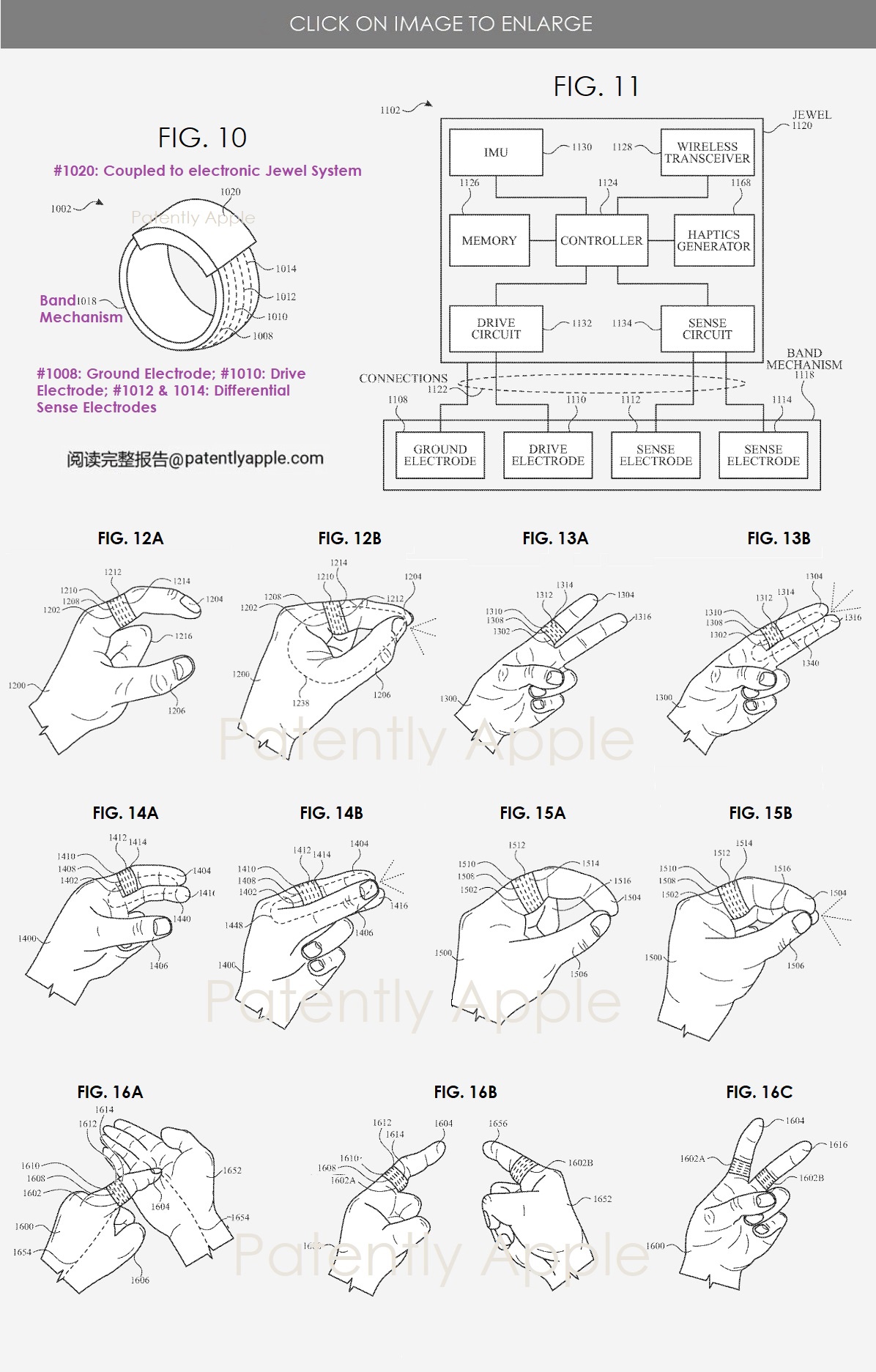 这款智能戒指专利主要服务于增强现实(AR)或者虚拟现实(VR)场景,用户需要在左右手分别佩戴一枚智能戒指,通过内置的传感器交互,来检测用户的手势,从而在虚拟环境中实现对应的操作。