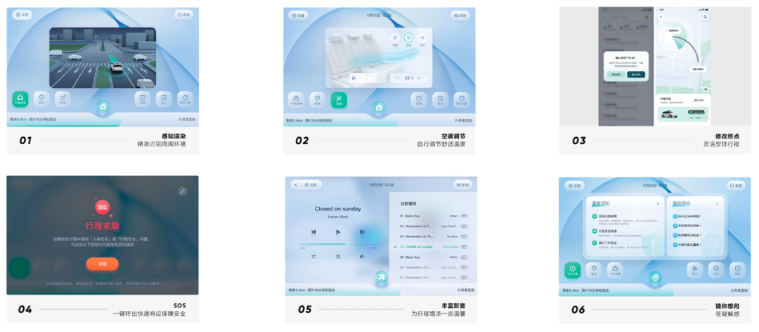 用户感受全无人智能乘车体验的同时,萝卜快跑也在不断提升全维度智能的安全保障。一方面,萝卜快跑提供全流程智能乘车引导,包括上车前的智能暗号找车、超时敦促,下车前的盲区监测和风险提示、展示右后方视频等,用以帮助用户安全快捷地乘坐无人车完成行程;在乘车过程中,也支持感知渲染帮助用户识别环境,用户自主调节空调温度、修改终点、一键呼出SOS等,打造舒适且有科技感的座舱体验。