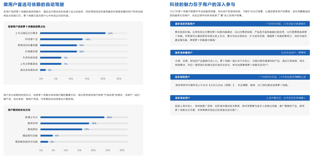 基于可靠的产品及服务质量,萝卜快跑在用户群体中也获得了良好的口碑。在“促使用户选择萝卜快跑的因素”调研中,“满足出行需求”及“科技感十足”占比较多,萝卜快跑已成为用户心中“科技出行”的代表。而用户的口口相传,也为萝卜出行进一步拓宽了潜在客群,例如在上海市嘉定区,有一位用户在自己使用过萝卜快跑的出行服务后认为非常方便,并推广给家乡人民,在2022全年带来了裂变新客520人。