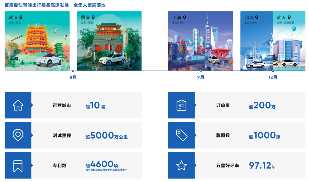 目前,萝卜快跑已覆盖北京、上海、广州、深圳、武汉、重庆等城市,在过去的一年间新增的商业化城市达7个,全无人自动驾驶出行服务城市已覆盖北京、武汉、重庆。伴随着百度Apollo在无人驾驶技术上的努力,越来越多的人也开始关注和了解自动驾驶领域、亲身体验无人车自动驾驶出行服务。
