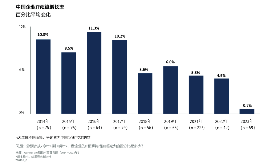 2023年,中国的IT预算预计平均增长仅为0.7%,而国内生产总值(GDP)的增幅预计约为5%(见图2)。如果考虑到通货膨胀(约2.1%),GDP的实际增长率约为3%(GDP减去通胀率),则IT预算实际上将有所下降。很多企业的CEO要求CIO在2023年削减IT支出。CIO应切实确保其有限的资金投入与业务重点保持一致,尤其是应确保对数字化和IT的投资能够推动以利润增长为目标的项目。