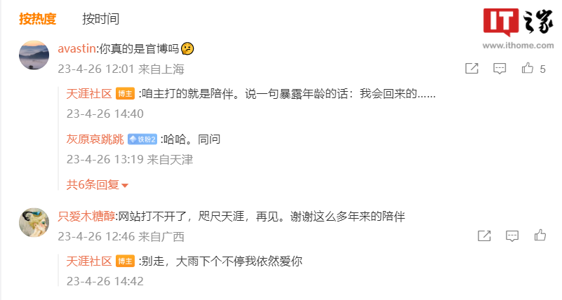 天涯社区的微博还在正常运营中。并且昨日“天涯社区”官博在评论区回复称:咱主打的就是一个陪伴。说一句暴露年龄的话:我会回来的……;别走,大雨下个不停依然爱你。
