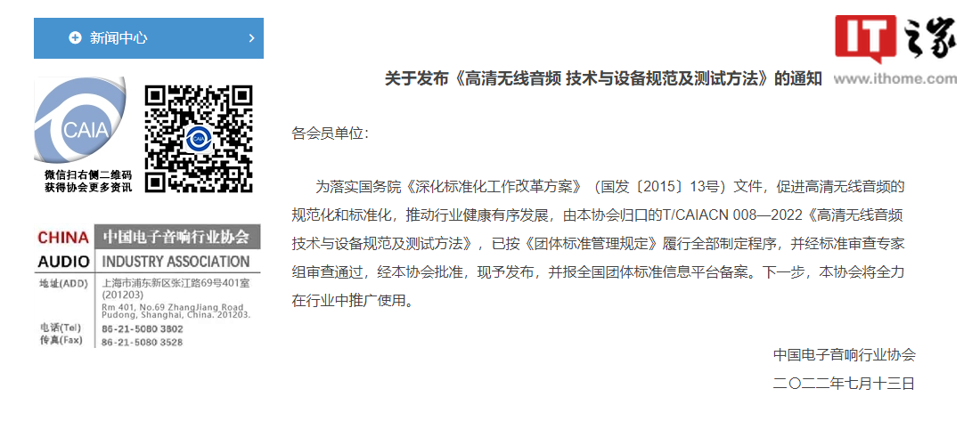 7月13日,中国电子音响行业协会联合森海塞尔、歌尔、华为等国内外 30 余家企业正式发布《高清无线音频技术与设备规范及测试方法》(简称 HWA 标准,Hi-Res Wireless Audio),该标准由中国电子音响行业协会与中国电子技术标准化研究院共同牵头发起,针对消费者对无线音频音质、连接、功耗、降噪等听音体验制定明确标准,将让高清无线音频体验走近更多消费者,持续促进音频产业发展。