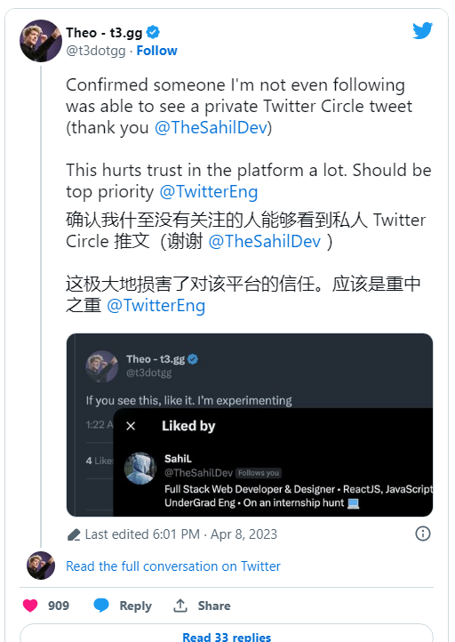根据 9to5Mac 和 TechCrunch 等多家国外科技媒体报道,自上周五开始,不断有用户反馈在“为你推荐”标签页中,看到来自未关注用户发布的 Twitter Circle 推文。