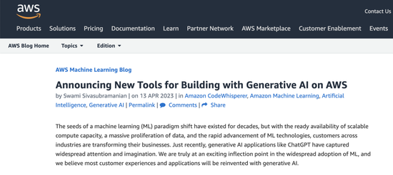 这封信随之而至,AWS在今早关于生成式AI的公告中提到:“ChatGPT是第一个引起客户注意的生成AI,但大多数研究者很快意识到技术潜力,有几种不同的FM(基础大模型)可供使用,每一种都具有独特的优势和特征,我们期待未来会出现新的架构,FM的多样性将掀起一波创新浪潮。”