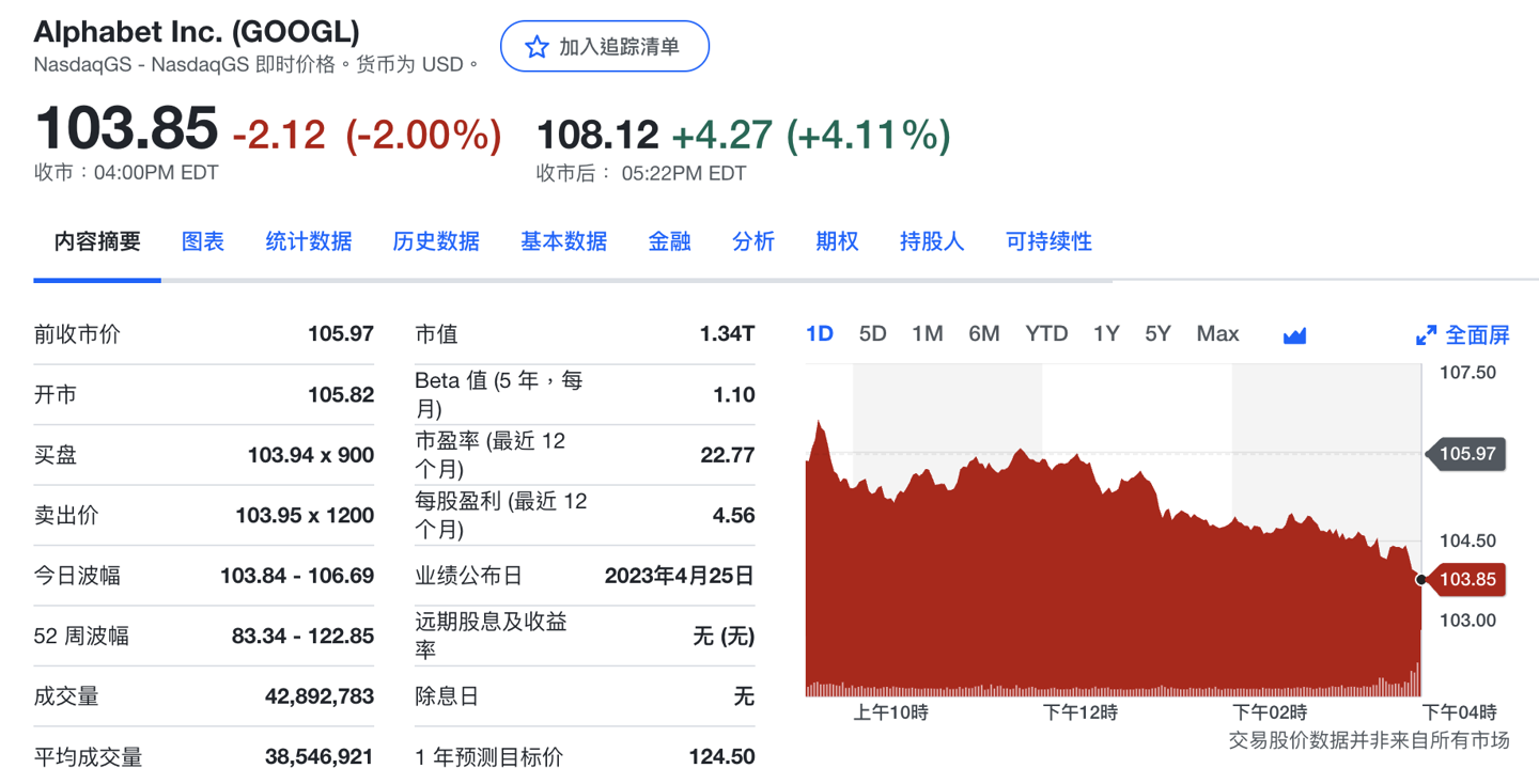 Alphabet A 类股 (GOOGL) 周二在纳斯达克交易所的开盘价为 105.82 美元。截至周二收盘,Alphabet 股价下跌 2.12 美元,报收于 103.85 美元,跌幅为 2.00%。截至美国东部时间周二 17:22 分 (北京时间周三 5:22 分),Alphabet 股价上涨 4.27 美元至 108.12 美元,涨幅为 4.11%。过去 52 周,Alphabet 股价最高为 122.85 美元,最低为 83.34 美元。