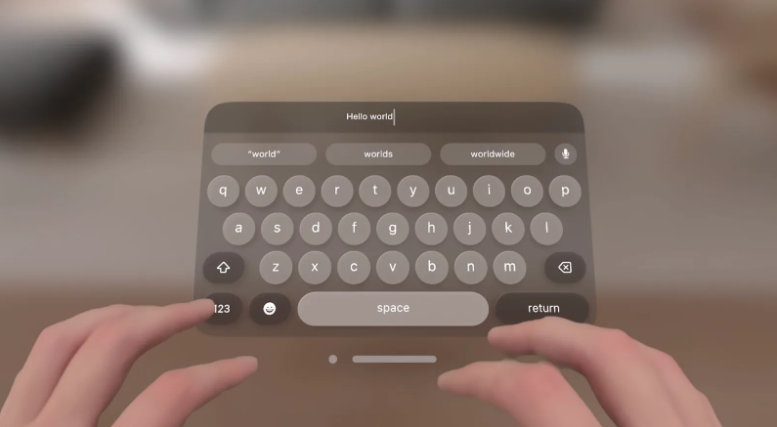 虚拟键盘可以让用户用手指在空中输入文字,苹果解释说,键盘的特殊设计能帮助用户更好地找到按键的位置。输入过程中还会有空间音效的反馈,来“弥补缺少的触觉信息”。按键实际上是凸起于键盘底座的,这样可以让用户有一种想要按下它们的欲望。当手指在键盘上方时,按键会显示一个悬停状态和一个高亮效果,随着手指靠近按键表面,高亮效果会变得更明显。这样就提供了一个距离提示,并帮助手指定位目标。当手指接触到按键时,状态变化非常快速,并伴随着匹配的空间音效。IT之家认为,这些额外的反馈层非常重要,可以弥补缺少的触觉信息,并让直接交互感觉可靠和具有满足感。