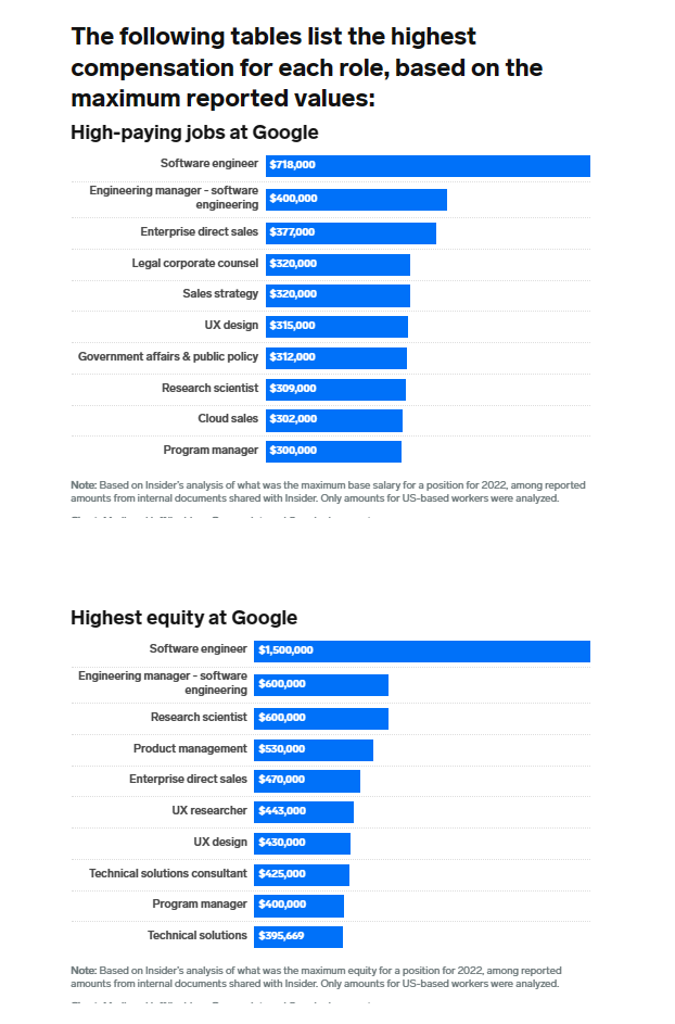 报告同时表示,谷歌员工的收入不仅限于基本工资,还包括股权和奖金。2022 年,软件工程师可以获得的最大股权为 150 万美元(约 1077.89 万元人民币)。
