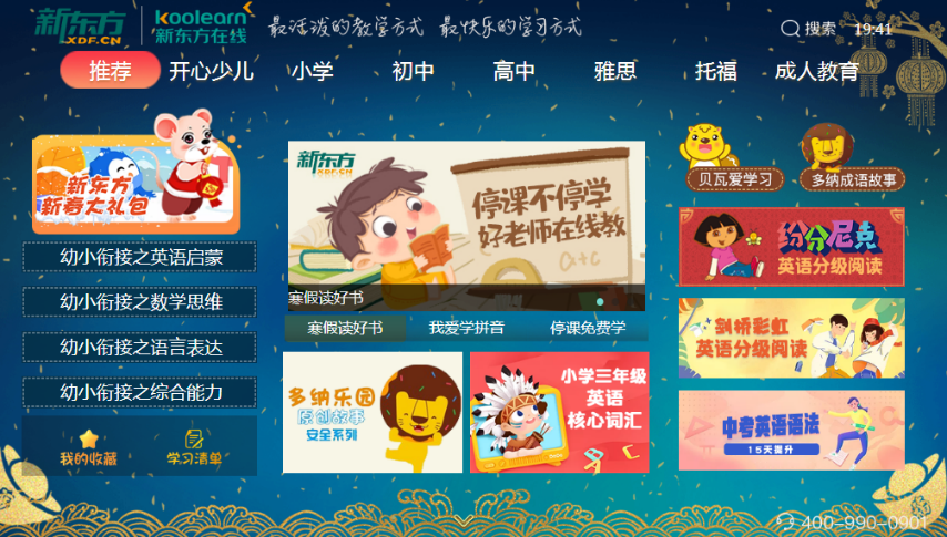 新东方的免费同步课程也已在天翼高清上线,孩子们在家即可访名师、听网课。内容涵盖小学一年级到高中二年级全部学科,整体授课难度与学校保持一致,知识点紧贴大纲,满足孩子们足不出户的学习条件,真正关爱孩子的学习成长需求。