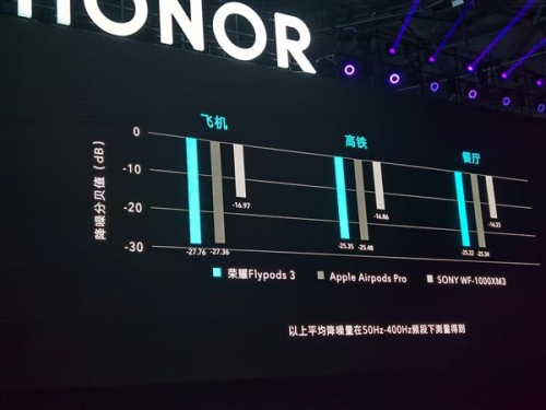 在发布会上,荣耀分享了荣耀FlyPods3和AirPods Pro在飞机、高铁、餐厅三大常见场景的降噪表现对比。可以看到荣耀FlyPods3的平均降噪分贝分别为27.76dB、25.35dB和25.22dB,苹果AirPods Pro的效果为27.36dB、25.48dB和25.34dB;两款产品在降噪能力上可以说旗鼓相当,但综合价格再一看是不是FlyPods3更香一些。