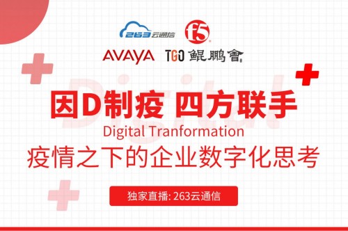 同时,为了帮助企业加速灵活应对新趋势、新挑战,Avaya、F5、263与TGO鲲鹏会四方携手,根据疫情期间各自的创新应用、解决方案、落地场景等,联合推出“因D制疫——疫情之下的企业数字化思考”系列线上直播讲座,邀请四方的技术专家、数字化顾问和IT架构师,通过在线论坛的形式联合诊脉,分享从策略到部署、从后台安全到前台实施的全方位经验解读,为企业应对突发事件开辟全新思路,为企业增强数字化转型能力提供方向。