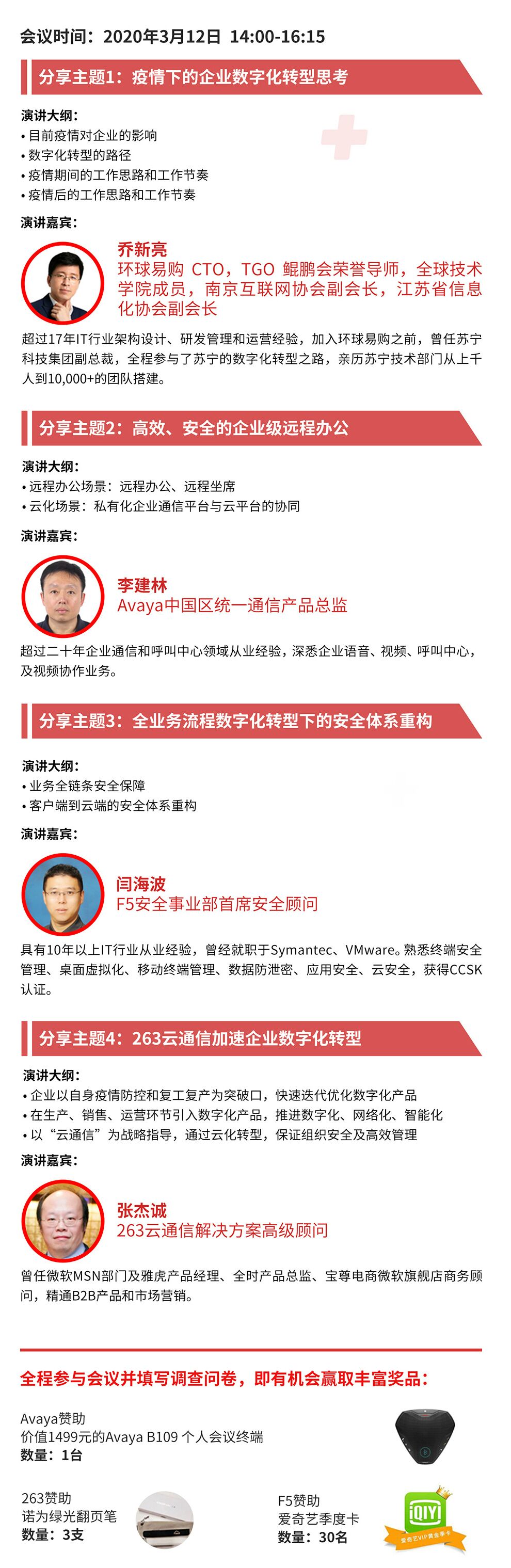 本次“因D制疫”线上直播讲座将于3月12日进行第一期直播讲座,环球易购CTO、TGO鲲鹏会荣誉导师 乔新亮、Avaya统一通信产品总监 李建林、F5安全事业部首席安全顾问 闫海波、263企业协同通信解决方案高级顾问 张杰诚,将以“疫情下的企业数字化转型思考”、“高效、安全的企业级远程办公”、“全业务流程数字化转型下的安全体系重构”、“263云通信加速企业数字化转型”为主题,分析疫情对企业带来的影响,探讨企业迈向移动化和云化的可行性和路径,解析如何在业务安全、需求供给等多方面齐头并进的研发与应用,为参会者们分享IT趋势发展及联合解决方案优势,并帮助企业技术领袖及时梳理数字化转型的方向和路径。