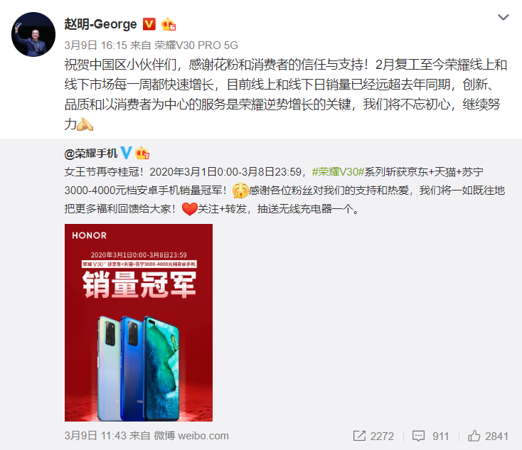 荣耀总裁赵明在微博上表示:“2月复工至今荣耀线上和线下市场每一周都快速增长,目前线上和线下日销量已经远超去年同期,创新、品质和以消费者为中心的服务是荣耀逆势增长的关键。”如此亮眼成绩也反应出荣耀的硬核品质得到了消费者的深刻认同。