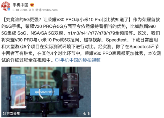 被业内誉为“5G标杆”的荣耀V30自去年底面世以来就广受好评,在多家专业媒体的对比测试中,荣耀V30的表现都取得优异表现。例如,与单模5G手机相比,荣耀V30的搜网、下载、上传以及信号稳定性都远远胜出;相比去年底上市的多个品牌双模5G手机只支持两三个5G片段,荣耀V30支持的5G频段最为齐全;而在专业媒体的荣耀V30、小米10对比测试中,荣耀V30的各项表现和整体品质也得到更多肯定。