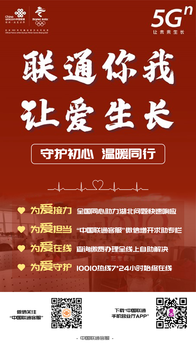 在国家“疫情就是命令,防控就是责任”的号召下,中国联通客服勇担央企责任,靠前服务、主动作为,想客户所想、急客户所急,推出了“联通你我 让爱生长”主题活动,实施“为爱接力、为爱担当、为爱在线、为爱守护”四大服务举措,给用户一如既往的贴心服务。