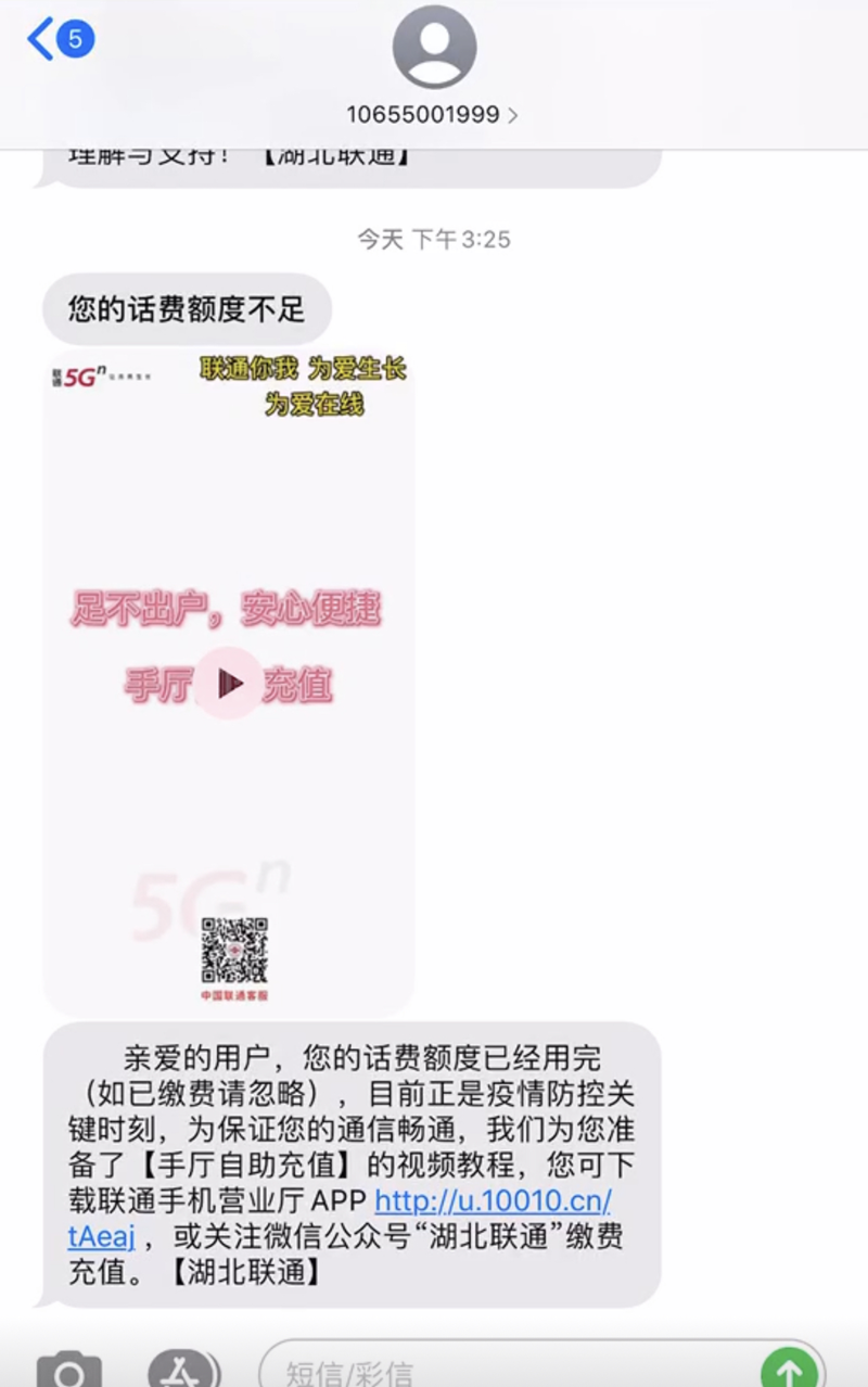 疫情防控期间,湖北分公司在延长缓停机服务导致账面欠费高,普通短信催交效果一般,中国联通互联网服务运营中心创新选用数字短信进行欠费提醒,并精准锁定群发名单,对两小时内欠费、账户余额正常、医护人员、学生、医院/方舱建设六类用户免打扰,实现高成功率,0投诉,累计缴费金额近7000万元,极大的缓解了分公司运营压力。