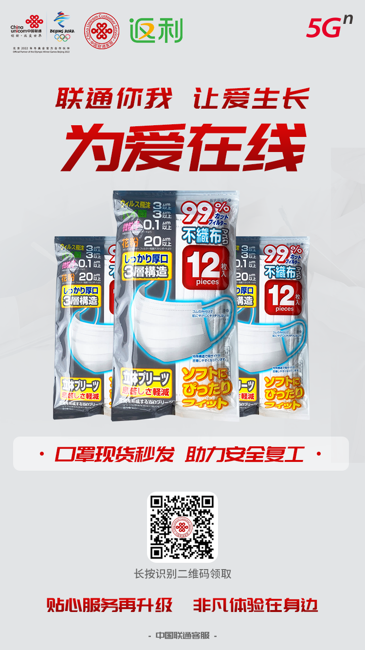 值得一提的是,疫情期间,“一罩难求”,中国联通客服为爱守护,联合返利网为粉丝筹集口罩,用户只需关注公众号,在联通俱乐部频道在活动页中领取专享码即可在返利网中进行购买,现货秒发,为粉丝们解决燃眉之急。
