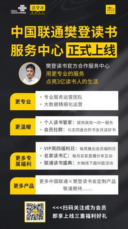 为庆祝“联通樊登读书服务中心”正式上线,服务中心更精心准备了三重迎新福利:即日起至24日前参与活动,樊登年卡买一年送一年;4月20日上线当天加磅推出VIP专属惊喜,会员凭樊登年卡买一赠一订单可10元换购价值百元的沃家智能摄像头、真无线耳机和AI音箱等智能产品;服务中心还将推出5元限量秒杀原价48元樊登读书月卡,加赠QQ音乐绿钻VIP的活动!微信搜索关注“联通樊登读书会”,即可成为会员,第一时间享受好礼!