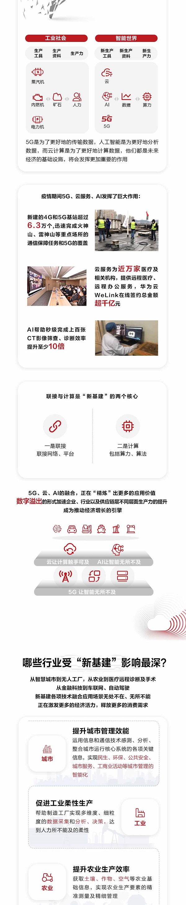此前,华为提出了2020年是云、AI、5G爆发的商业元年。而“新基建”的出现,大大加速了这个过程。基础设施是人类最主要的资本,以IT基础设施、智能化的基础设施作为突破口的“新基建”的加速到来,将使得人与世界的的关系发生颠覆性变革。在这一变革下,平台化企业无疑将发挥更突出的作用,如华为凭借长期投入和实践积累,以结构化布局在“新基建”关键领域铺设了底层框架,在云、AI、5G等领域建立起了独特的领先优势,势必将成为助力“新基建”核心技术应用的“关键角色”。