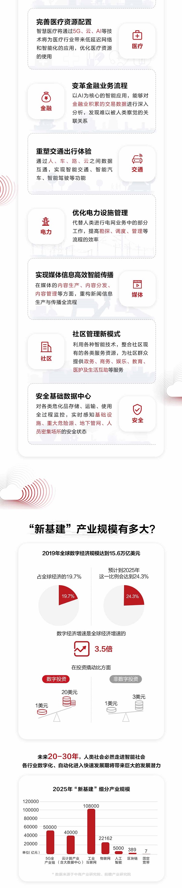 在发改委明确的“新基建”最新方向中,重点聚焦以5G基建、物联网、工业互联网、卫星互联网、人工智能、云计算、区块链、数据中心、智能计算中心为核心的信息基础设施领域,更加注重数字化、智能化等科技创新,同时,“新基建”也是立足现实,应对疫情冲击、促消费稳增长的有效手段,更是面向长远,构筑数字经济创新发展之基。
