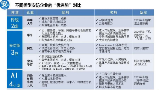 智能化大潮下,安防行业更加向头部企业集中。2020年伊始,年报显示网力、科达、汉邦等第二梯队安防企业的利润剧减甚至亏损;2020年伊始,统计显示深圳安防企业同比减少8%,生产商减少,工程集成商增加。生产商向寡头聚集的趋势可见一斑。海康,大华增速放缓的同时,华为、云从、依图等AI公司营收成倍增长,显然不是安防智能化的空间不够,是安防行业格局发生了变化。