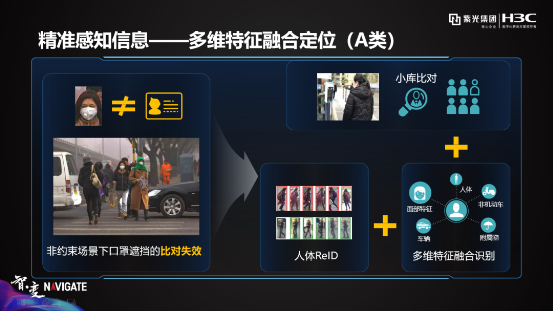 新冠病毒的感染人群分为A、B、C、D四类,A类人员是指有武汉接触史的人。口罩遮住了行人的绝大部分特征,非约束场景下的摄像机无法精准定位到行人的感染路径。通过人体ReID技术,通过人体、附属物、非机动车、机动车等多维特征融合技术,精准定位A类人员的行为轨迹,根据社区人员的小库比对确定A类人员身份。