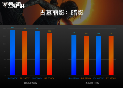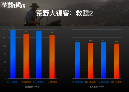 《荒野代镖客:救赎2》是R星发布的一款2019在PC上的3A大作,画质以场景壮丽大气人物细腻生动闻名。在1080p分辨率模式下高主频性能对游戏整体帧率影响较大,i9-10900K与i5-10600K明显胜出各自对手10%左右,表现十分抢眼。当测试分辨率提高至1440p后英特尔酷睿依然保持一定优势,特别是i5-10600K表现夺目,性价比尤为突出。