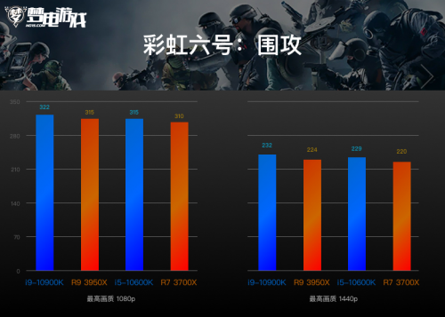 《彩虹六号:围攻》是育碧研发的FPS5v5电竞游戏,和其他3A游戏相比它相对来说对硬件要求不高。这次跑分的四块CPU都可以发挥不错成绩,在1440p下都可以跑出接近240帧的优秀水平。其中英特尔CPU依然保持5%左右优势,AMD无论是1080p还是1440p都保持稳定水平。