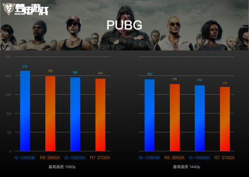 《绝地求生PUBG》是虚幻4引擎打造,由于已上线对硬件优化也越来越好。这几款CPU跑分依然是高主频有着更好的性能表现,其中i9-10900K凭借全核5.3Ghz性能表现爆表,不仅在1080p分辨率下甩开其他CPU,在1440p分辨率下也表现突出。
