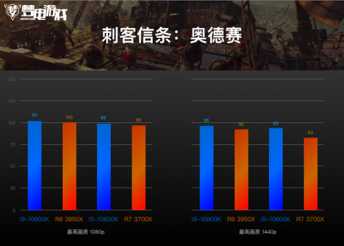《刺客信条:奥德赛》是育碧旗下热门动作品牌最新一部,采用育碧自家引擎打造,游戏为沙盒类型,整个游戏场景面积广阔无比,地图细节设计程度也十分丰富,对于CPU的预算也有着极高的要求,在测试中高主频的优势在1080p下不太明显,但分辨率达到1440p时优势逐渐明显,其中i5-10600K依靠单核4.1Ghz睿频4.8Ghz再1440p情况下拉开R7 3700X有10%左右。