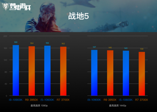 《战地5》是EA采用寒霜引擎,同时也是标准的3A射击类游戏标杆,游戏有着大量的真实火爆的战斗场面,其中这些画面效果给GPU和CPU也有不小的压力。在我们跑分结果中单核高主频略微胜出,i9-10900K和i5-10600K在1080p模式下,帧数稳定保持2~5帧左右优势。
