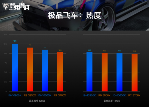 《极品飞车:热度》是EA公司旗下竞速游戏,与《战地5》相同采用自家寒霜引擎。在这几款CPU的比拼中1080p下i9-10900K表现非常突出,超过R9 3950X 10%之多。但在1440p分辨率下帧数基本保持同一水平,其中i9-10900K以3帧优势略微胜出。