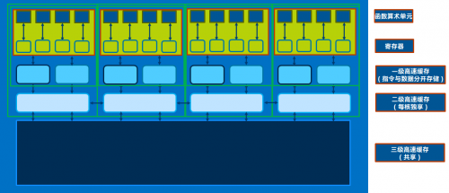 多核CPU很显然,是一个完整封装的CPU产品中拥有多个理论上可独立工作的CPU内核的处理器,这里的多个内核可同时并行的执行一个任务中的多个线程,或者并发性的在不同的核心上执行不同的任务,每个内核理论上都有专属于自己的前端取指译码单元,缓冲区,执行单元,寄存器,缓存以及总线资源,现代多核CPU还拥有可共享的资源,比如最后一级缓存,内存总线等,都是能被一个CPU里的各个内核共享的,通过特定的总线保持数据的同步和交换以及一致性。