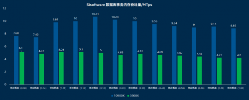 这还是在核心间直接通信,没有明显的一致性和数据竞争需求,而在事务内存负载中,通过一个数据库常用的B-Tree索引算法,在执行中涉及并发的数据修改对内存一致性和准确性的要求,往往需要加锁,而加锁的粒度越大,则会更明显的影响并发性,其对系统的数据同步和数据一致性有较高要求,这必然涉及复杂的不同核心与其存储器之间的通信,随着核心数的增多,会变得越发不容易实现高并发,Intel在9代高端桌面处理器上支持TSX指令集,能大幅提高这类粗粒度锁算法的性能,但Cometlake-S没有支持TSX指令集,但这么一来,即使是与AMD R9 3900X 12核心处理器进行对比,10900K依旧在事务内存吞吐上优势非常明显,尽管这类高性能数据库需求对普通用户很少见,但也说明Intel处理器在苛刻条件下的适应能力。