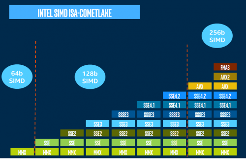 实际上,用户要想获得最佳的性能体验,不仅需要一个强大的峰值性能,也需要尽可能少的短板,扩展一倍的核心数,固然相当于比过去处理器多出了一倍的执行单元,但提高并行性能如上所述,可以通过宽流水线,多发射,宽矢量指令SIMD来实现,同时通过加深乱序执行性能,分支预测性能和同步多线程SMT性能,在把单个核心的并行和并发潜力发掘后,再去扩宽多核心的实现,所以,从酷睿i系列开始,虽然Intel处理器一直保持四核心八线程,但实际上SIMD矢量位宽从128位到256位再到256位乘加融合,以及最新Icelake的512位乘加融合执行性能,同时乱序执行窗口从128个队列扩大到Skylake的224个队列,Icelake还拥有超过300个队列的乱序窗口和重排缓冲区,AGU端口也不断增加,可以说,Intel在尽可能挖掘单核心下的并行并发能力后,才去堆核,因为多核的运用协调一致运行的难度更高,能在一个核内完成显然更为有利于用户和开发者的使用,所以Intel在不断优化设计更宽的流水线,更强大的执行单元,更深的缓冲区,而在10nm受阻,微架构的优化进度放缓后,Intel便开始了增加核心数的手段,从8代的6核,到9代的8核,10代的10核,逐渐提高了核心数量,但架构的变化则基本没有,只有Icelake产品是全新的架构,但依旧为4核心8线程。但无论如何,即使是高度并行的程序,也需要多线程+矢量化双管齐下,才是最佳的并行性能。