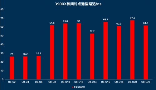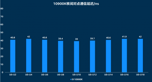而Intel 10900K 10个核心的直接通信延迟则始终保持在一个稳定较低的范围(40ns)。