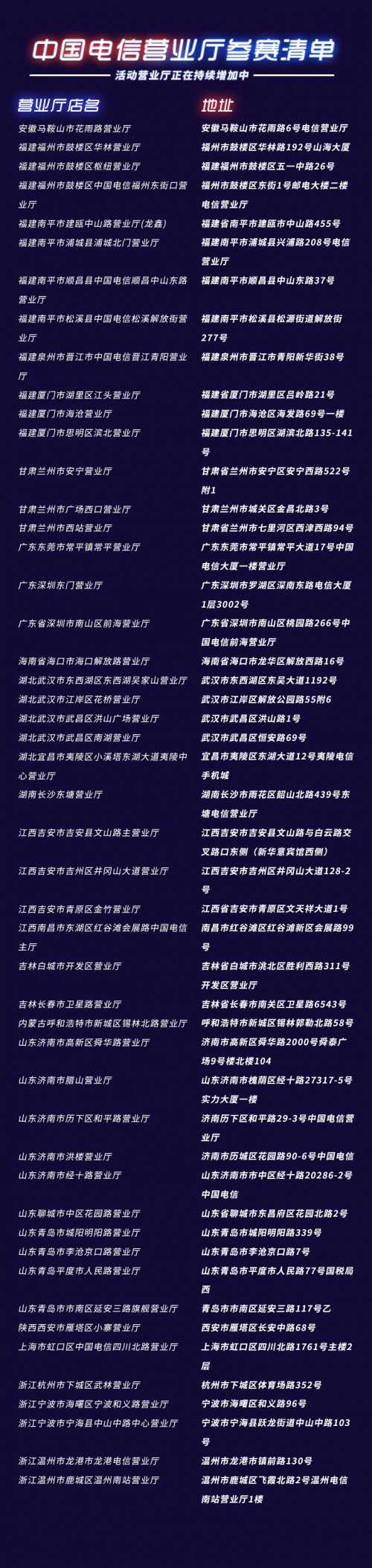 由网易影核联合中国电信天翼云VR重磅打造的《节奏空间》首个全国VR电竞挑战赛正在如火如荼进行中,拉开了集VR体验、电竞对抗、社交场景于一体的“V世代”娱乐盛会的大幕。本次VR电竞挑战赛分为初赛、战区赛和总决赛三大赛段,在7月25日至10月初燃情上演,并提供丰厚的奖品和10万元总奖金池。玩家们可以通过遍布全国的2000余家线下合作VR门店参赛,而除了网易影核的官方参赛通道,作为全球首个基于云游戏技术的VR游戏平台,中国电信天翼云VR还为玩家们提供了额外的VR“打卡点”。玩家们可以直接到指定的中国电信营业厅(见文后附图)参与本次《节奏空间》全国电竞挑战赛,沉浸在光影的世界里,尽情挥砍飞驰而来的节奏方块,体验VR云游戏带来的感官震撼!