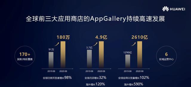 作为全球前三大应用分发平台,华为应用市场始终保持高速发展。截止到2020年8月底,华为应用市场已覆盖170多个国家和地区,全球月活用户超过4.9亿,同比增长超过32%,全球应用分发量超过2610亿,全球应用分发量同比增长102%,其中海外同比增长达590%。