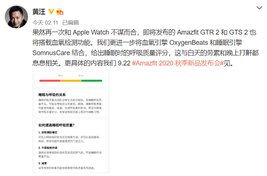 发布会结束之后,华米科技CEO黄汪在微博上表示“再一次和Apple Watch不谋而合”。黄汪表示,华米本月发布的新品Amazfit GTR 2和GTS 2也将搭载血氧检测功能。同时,手表还将进一步将血氧引擎OxygenBeats和睡眠引擎SomnusCare结合,给出睡眠时的呼吸质量评分。