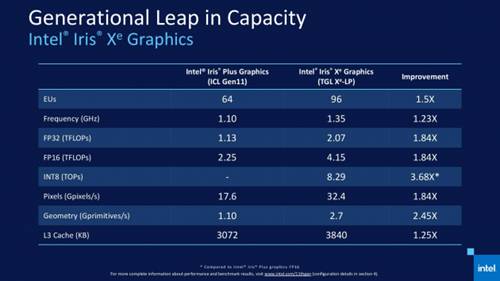 除了制程和架构层面的变化,Xe也不出意外地加入了“军备竞赛”,核心硬件配置全面升级,即使没有频率层面的大幅提升,其各项性能也有了历年来最大的一次提升。其中,在个人消费者最关心的游戏性能方面,预计全速功耗在28W以内的Xe(96EU)产品,某些性能指标接近MX350的水平。而做为集成显卡,功耗大幅低于独显是最基本的素质,而硬币的另一面就是GPU与CPU相平衡的功耗水平,且不因为散热能力的问题相互影响性能发挥。Iris Xe频率及功耗的定义,刚好可以不改变散热系统设计,简化了产品设计的复杂度,并且不影响笔记本电脑的超薄化进展。