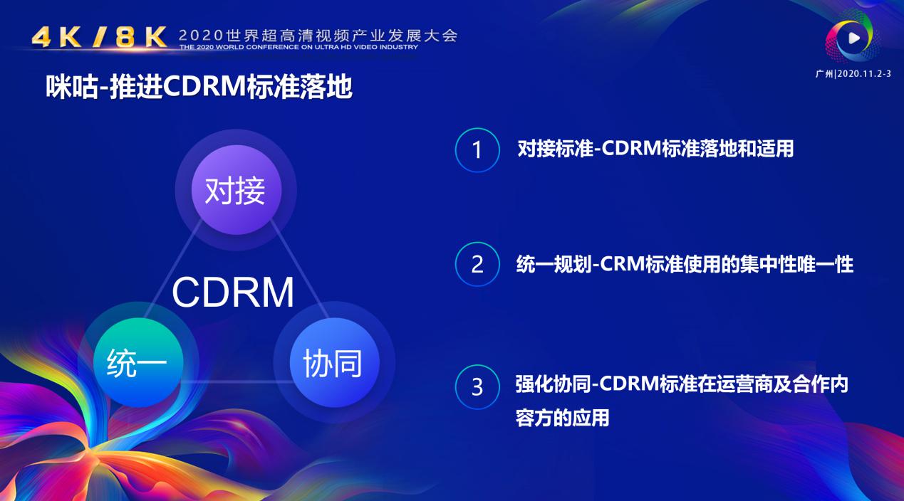 中国移动咪咕ISG-法律共享中心(董事会办公室)VP贾磊介绍道:未来,咪咕将从三个层面与产业各方一起推动ChinaDRM标准的落地。首先是对接标准,ChinaDRM标准落地和适用;其次是统一规划,ChinaDRM标准使用的集中性、唯一性;最后是强化协同,ChinaDRM标准在运营商及合作内容方的应用。 在本次大会上,腾讯视频,华为技术,广东南方新媒体展示了ChinaDRM的解决方案落地使用情况,咪咕文化,爱奇艺,优酷等主流视频服务厂商都表达出积极落地ChinaDRM解决方案的意愿,预计各厂商都将在2021年上半年完成对于ChinaDRM方案的部署和商用。其余到场的各位嘉宾也分别从产业出发,站在企业的角度分享了对ChinaDRM产业发展的看法与企业规划。 未来,相信产业界各方一定会按照ChinaDRM技术标准规划共同形成合力,推进ChinaDRM技术标准在全球范围内的广泛产业化部署实施。