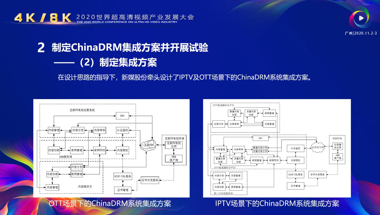公司高级副总裁、产业研究院院长王兵博士介绍:新媒股份牵头负责了IPTV及OTT场景下的ChinaDRM集成方案设计,并基于集成实验过程中不断优化的方案和总结的经验,制定了IPTV和OTT应用场景下的ChinaDRM集成规范。同时还将于2021年6月前组织百视通、华数、银河及腾讯共同开展不少于80万用户的基于国产密码算法的超高清视频内容版权保护技术试点示范。