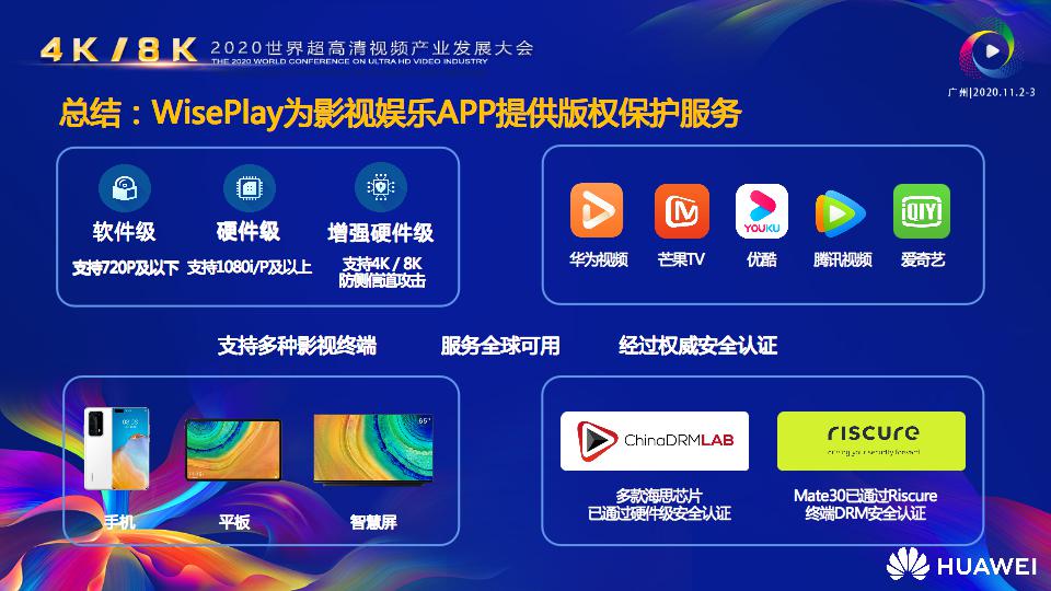 为支撑全球超高清音视频产业发展,实现对高质量音视频内容的保驾护航,值“2020世界超高清视频(4K/8K)产业发展大会”盛大开幕之际,在国家广播电视总局、中央广播电视总台、工业和信息化部和广东省的指导和支持下,国家广播电视总局广播电视科学研究院、中国国际电视总公司、中国移动咪咕公司、广东南方新媒体股份有限公司、华为终端有限公司、上海海思技术有限公司等产业链各方优势机构发起成立了“数字版权保护信任中心”,共建数字版权保护基础信任体系,以市场化方式维护产业链各方在版权保护权利和责任方面的平衡,支撑国内外产业链各方低成本、快速部署音视频内容版权保护技术。